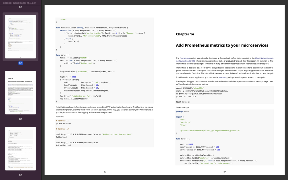 It's also useful as reference material for experienced Go developers, for instance - the author uses the GitHub Actions and Prometheus chapters as a refresher when creating new services.