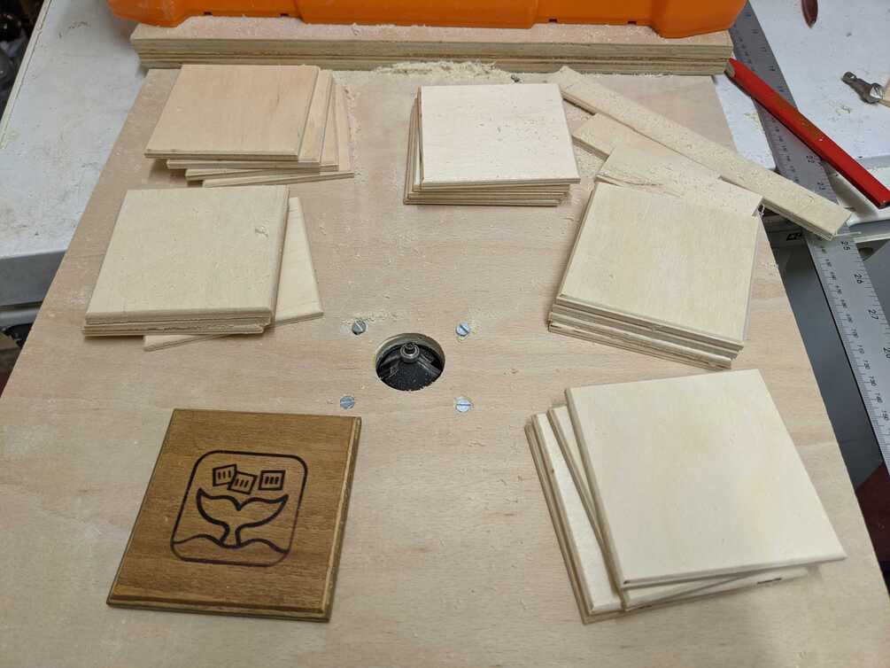 It starts by selecting the highest quality birch plywood from a sustainable force. Then each piece is cut into 9x9cm squares on the bandsaw. After that, I use a homemade router table to ease over the top edges and create an attractive bevel. Then on a sunny and still day, I fire up the gas and heat up the branding iron and stamp each of them. Finally, they get smoothed over with sand paper and then a number of layers of protective varnish.