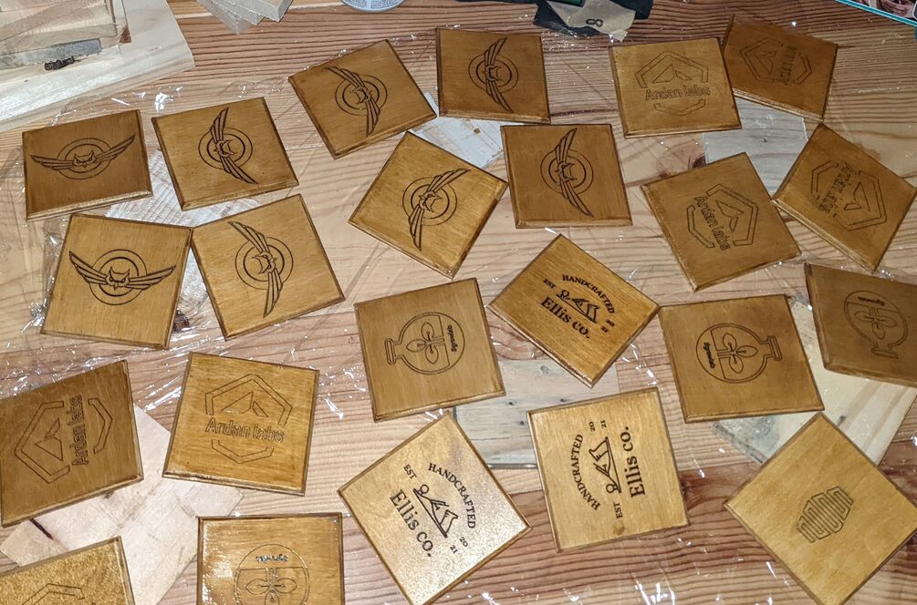 It takes just over 1 hour to burn the logo onto four coasters and then several more hours to bevel, sand and varnish your custom coasters before packaging them up and sending them out.